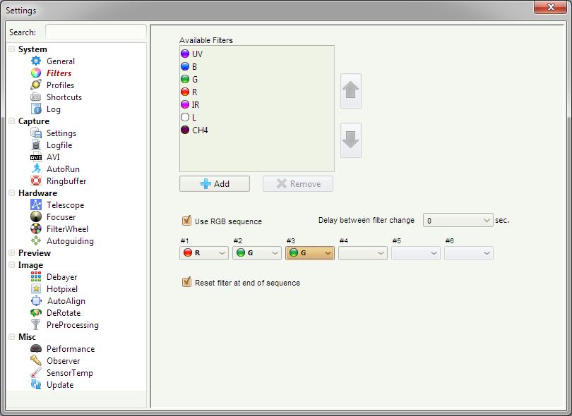 When checked the filter drop-down boxes below gets activated and you can set an arbitrary sequence of filters as RGB sequence. This means whenever you have finished a capture for a filter that is included in this sequence FireCapture will automatically switch to the next filter in that sequence. |